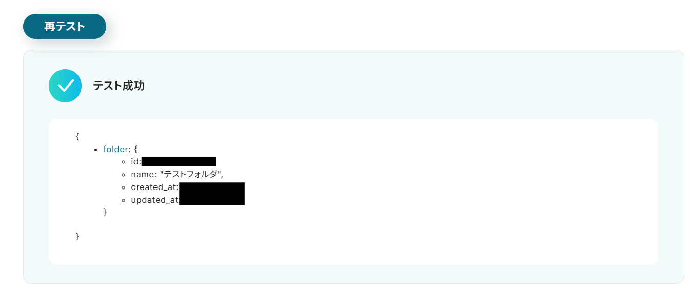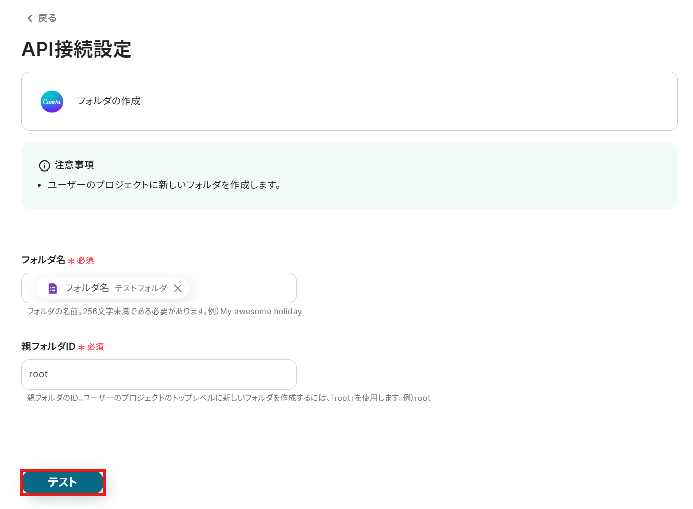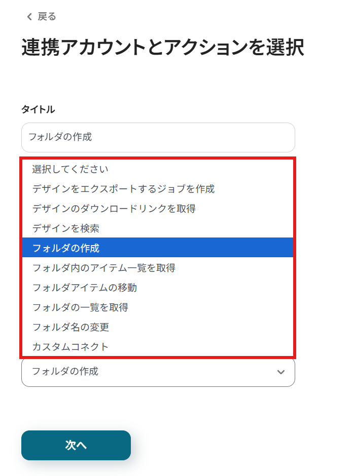 - 最後に、オペレーションでCanvaの「フォルダの作成」アクションを選択して、任意のフォルダ名で作成されるように設定します。