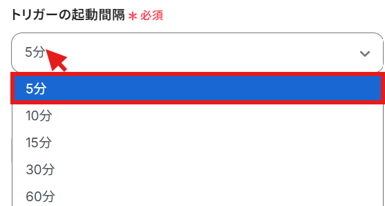 - トリガーは5分、10分、15分、30分、60分の間隔で起動間隔を選択できます。