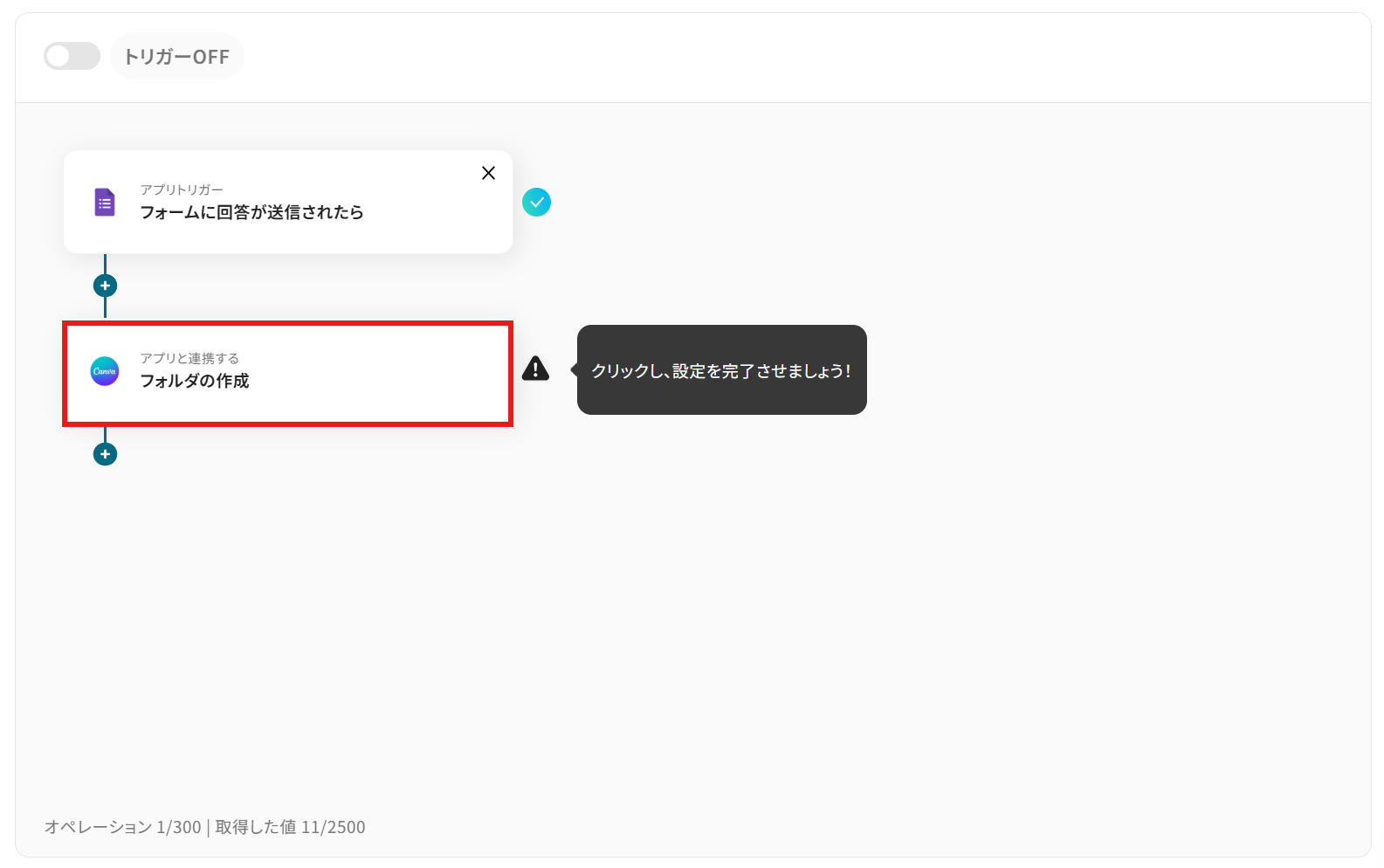 - 最後に、オペレーションでCanvaの「フォルダの作成」アクションを設定し、指定した条件を満たした場合にフォルダが作成されるようにします。