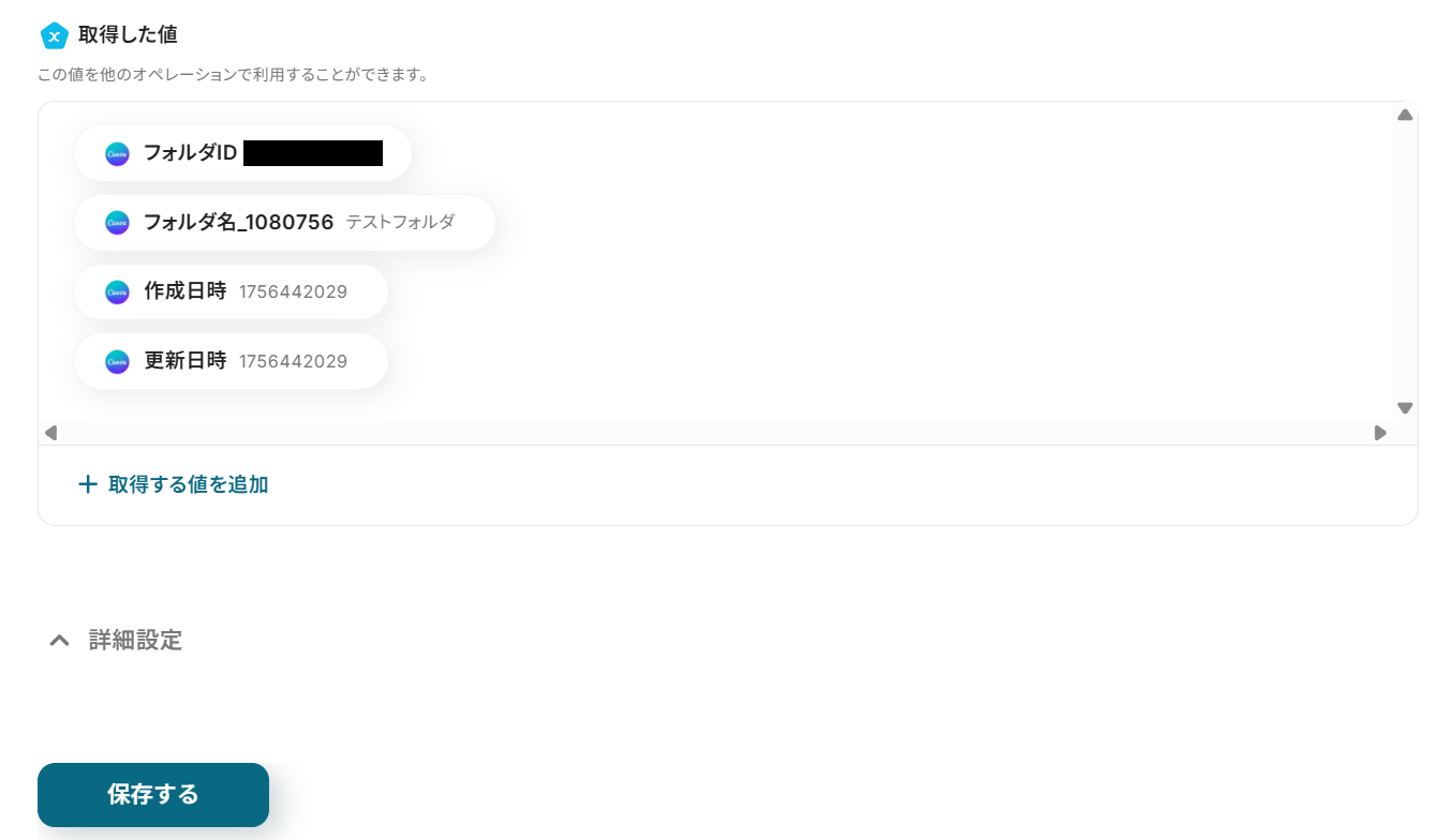 - 最後に、オペレーションでCanvaの「フォルダの作成」アクションを設定し、OCR機能で読み取った情報を基にフォルダを作成します。