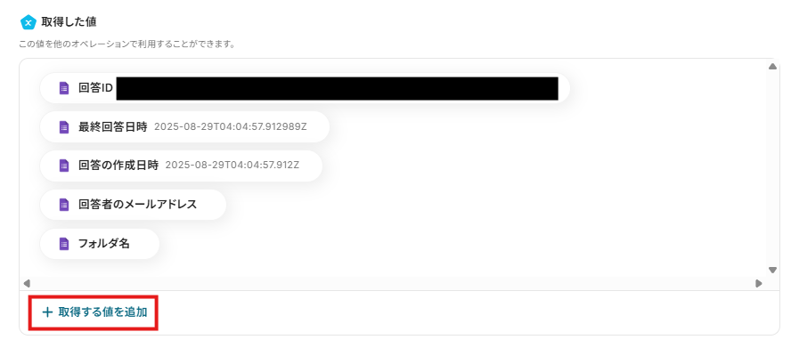 - Googleフォームをトリガーとして使用した際の回答内容を取得する方法はこちらを参照ください。