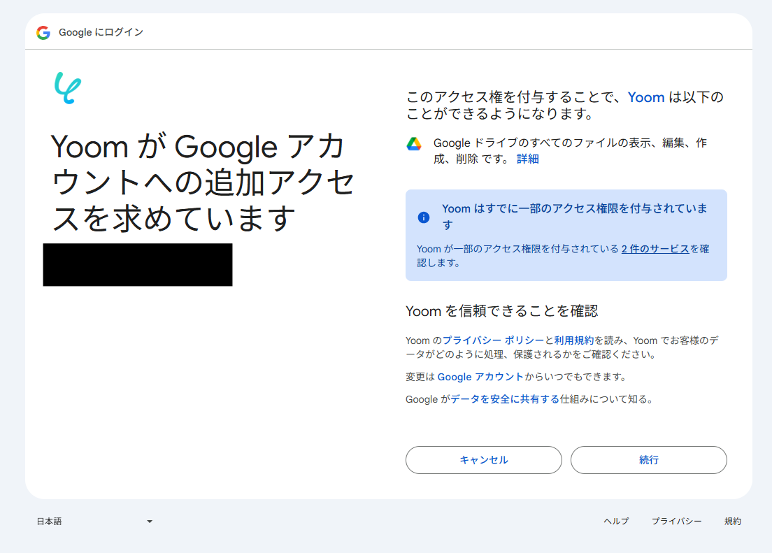 アクセス権限の確認画面が表示されるので「続行」をクリックして連携を完了させましょう。