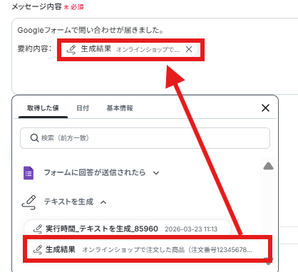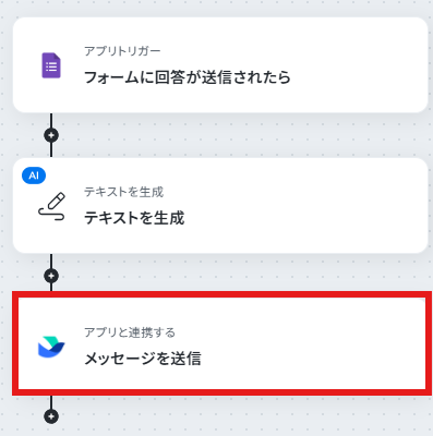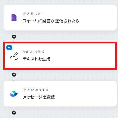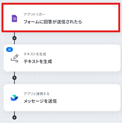 Googleフォームのトリガー設定では、連携の対象としたいフォームのIDを任意で設定してください。 AI機能の「テキストを生成」アクションでは、「以下の問い合わせ内容を箇条書きで要約してください」など、出力したい内容に合わせてプロンプトを任意に設定してください。 ■注意事項