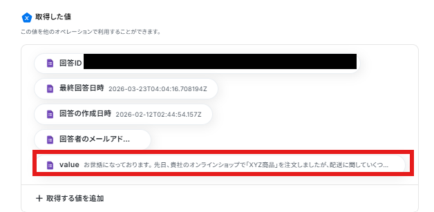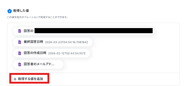 取得した値の下部にある、「+取得する値を追加」をクリックします。