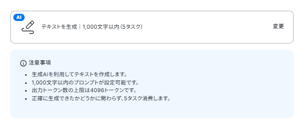 AI機能でテキストを生成するアクションでは、要約の形式や文字数など、アウトプットしたい内容に応じてプロンプト(AIへの指示)を任意で設定してください。 ■注意事項