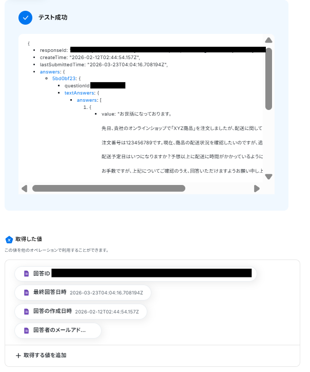 入力ができたら「テスト」ボタンを押してみましょう。連携が成功すると以下のように取得した値が入りますが、このままでは回答内容の文章が取得できていません。