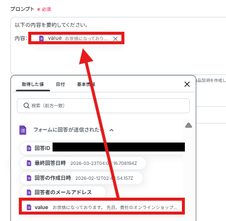 プロンプトはデフォルト通り、取得した値を使い以下のように入力しています。 取得した値を活用することで、固定値ではなく、トリガーが実行されるたびに最新の情報が反映されます。