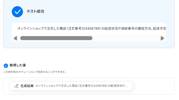 ここまで設定したらテストボタンをクリックしてください。テストが成功し、要約された内容が取得した値に入ります。