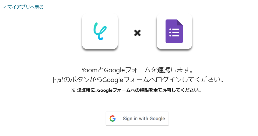 Googleフォームのマイアプリ連携 Yoom画面左側の「マイアプリ」→「新規接続」をクリックします。 「アプリ名で検索」からGoogleフォームを検索するか、アプリ一覧から探してください。 以下の画面が表示されたら、「Sign in with Google」をクリックしましょう。