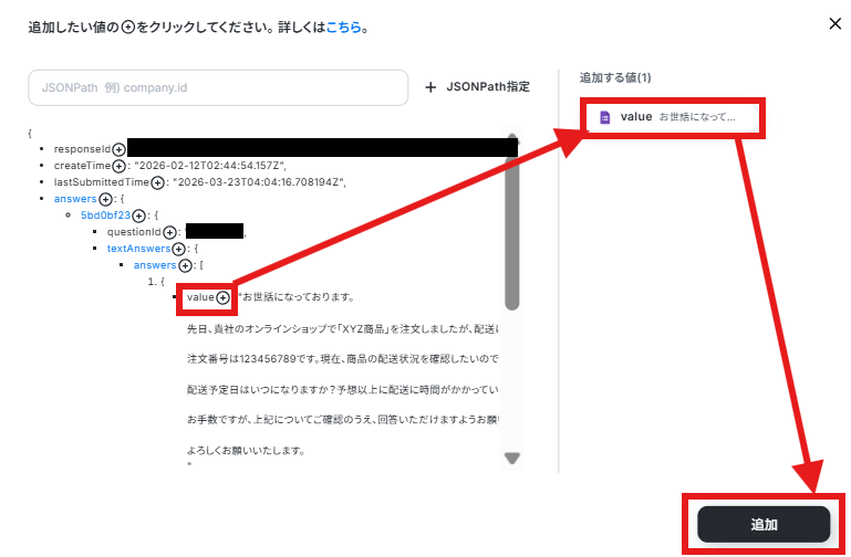 取得した値に追加したい値の「+」ボタンを押して追加ボタンを押します。