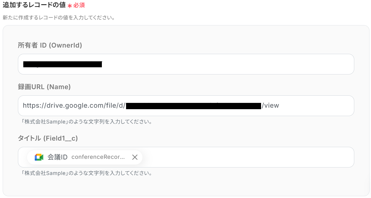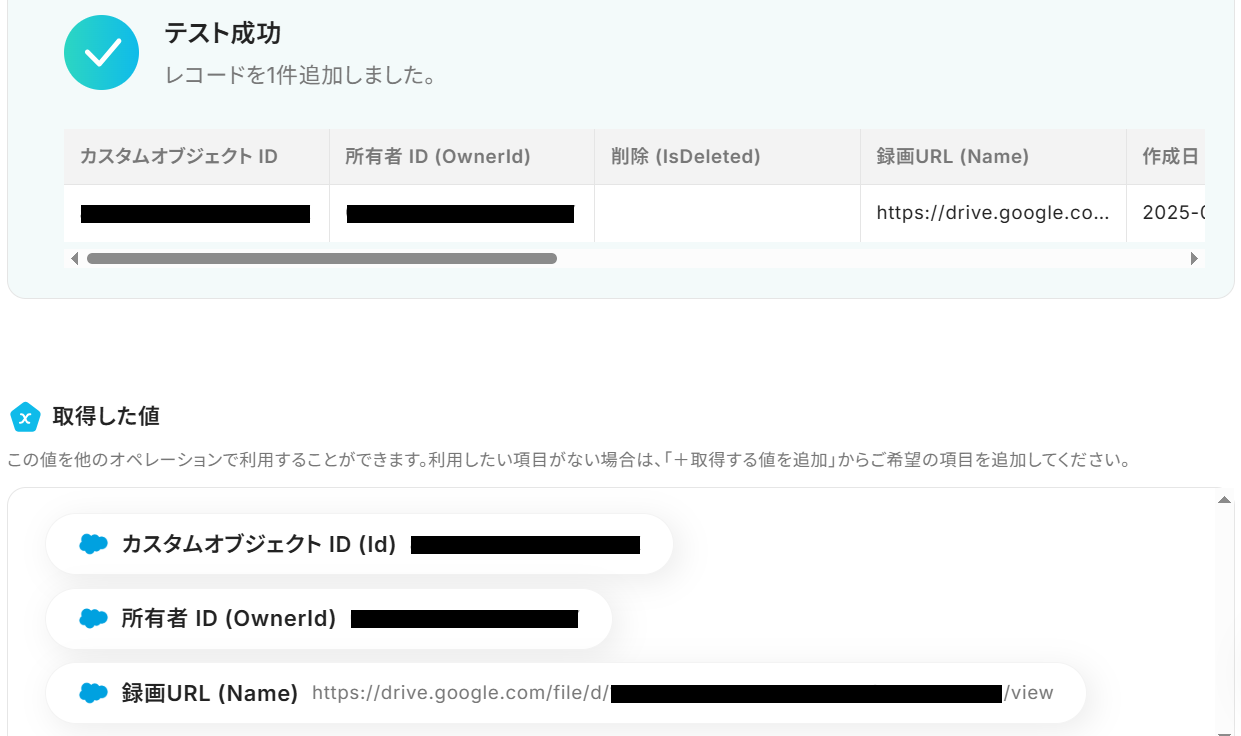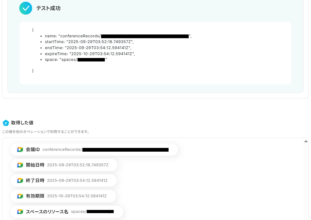 ※今回はテストであり録画URLを取得できていないため、固定値を入れてテストしました。実際の運用では、上記のようにGoogle Meetから取得した値を設定することで変数として利用できます。
