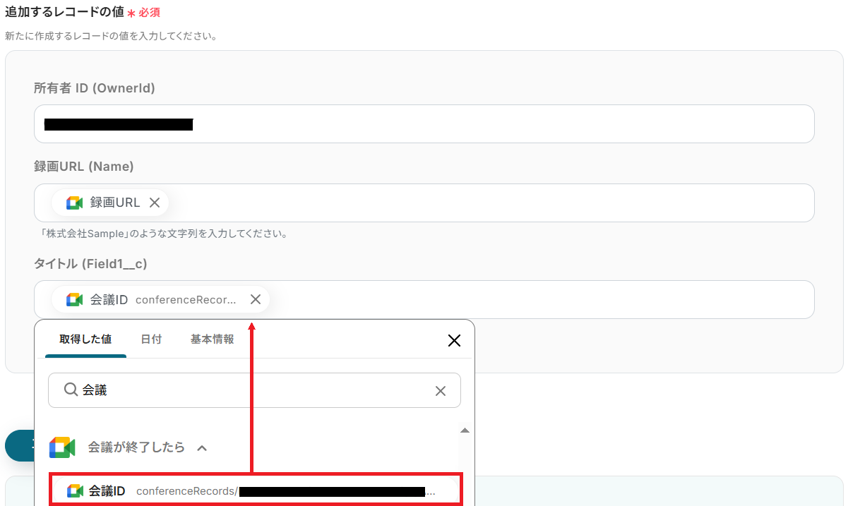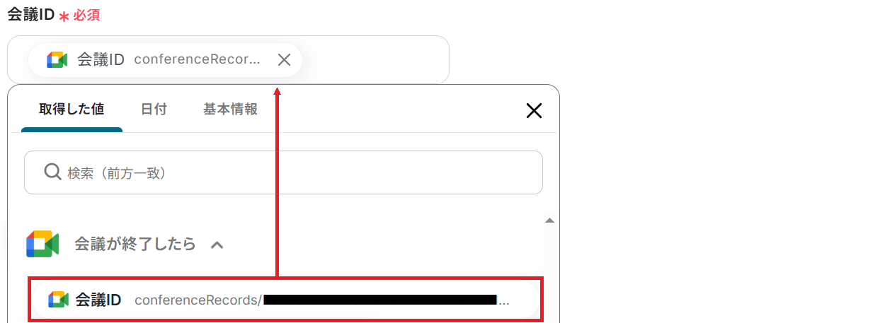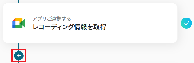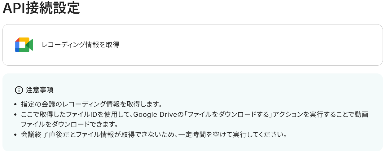 Google Meetのトリガーアクションはデフォルトでは取れるデータが少ないため、詳細情報を取れるこのアクションを設定し、後続で使用できる値をより詳細に取得していきます。 「レコーディング情報を取得」をクリックしましょう。