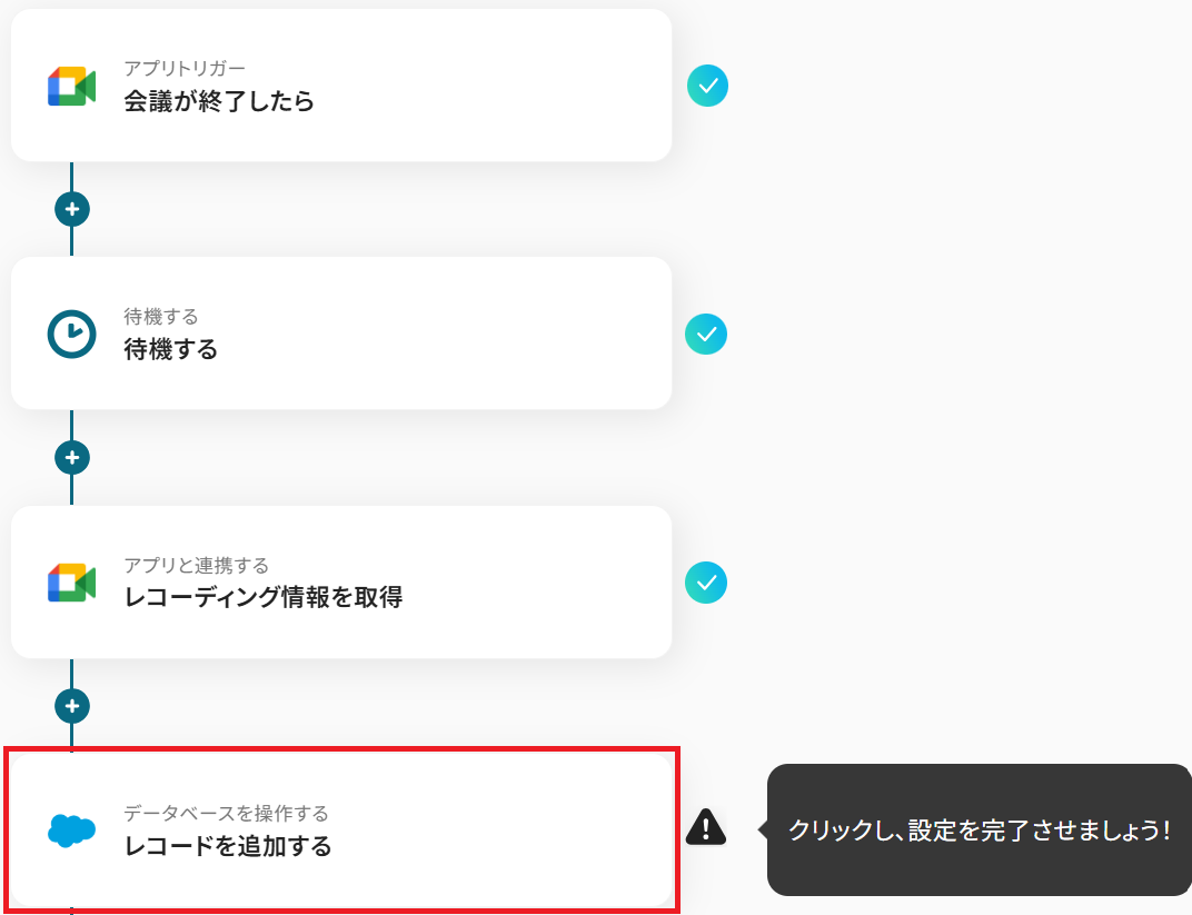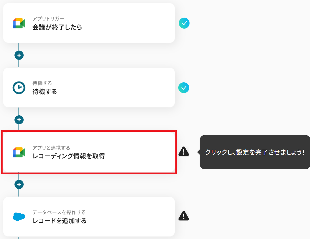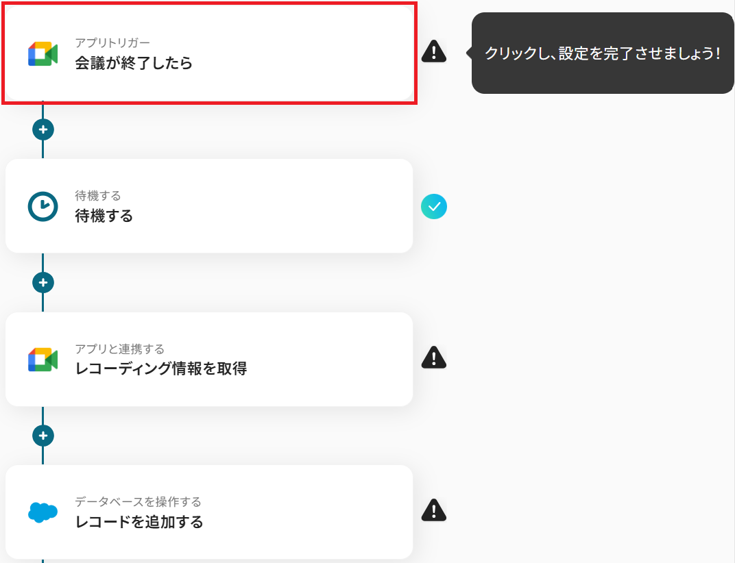 Google Meetのトリガー設定、待機設定、Google Meetのアクション設定、Salesforceのアクション設定