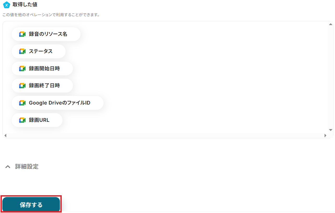 成功したら保存しましょう。 ここで取得した値を次以降のステップで活用します。