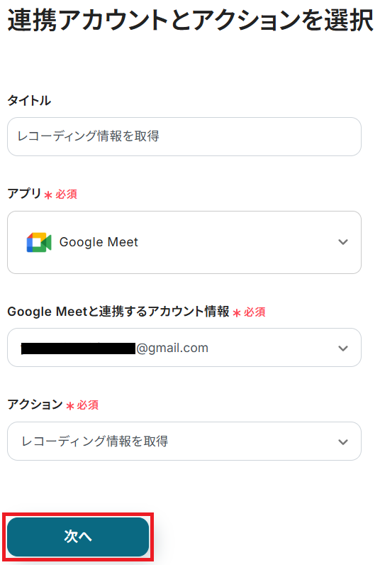 ステップ3と同様、アクションは「レコーディング情報を取得」のまま「次へ」をクリック。