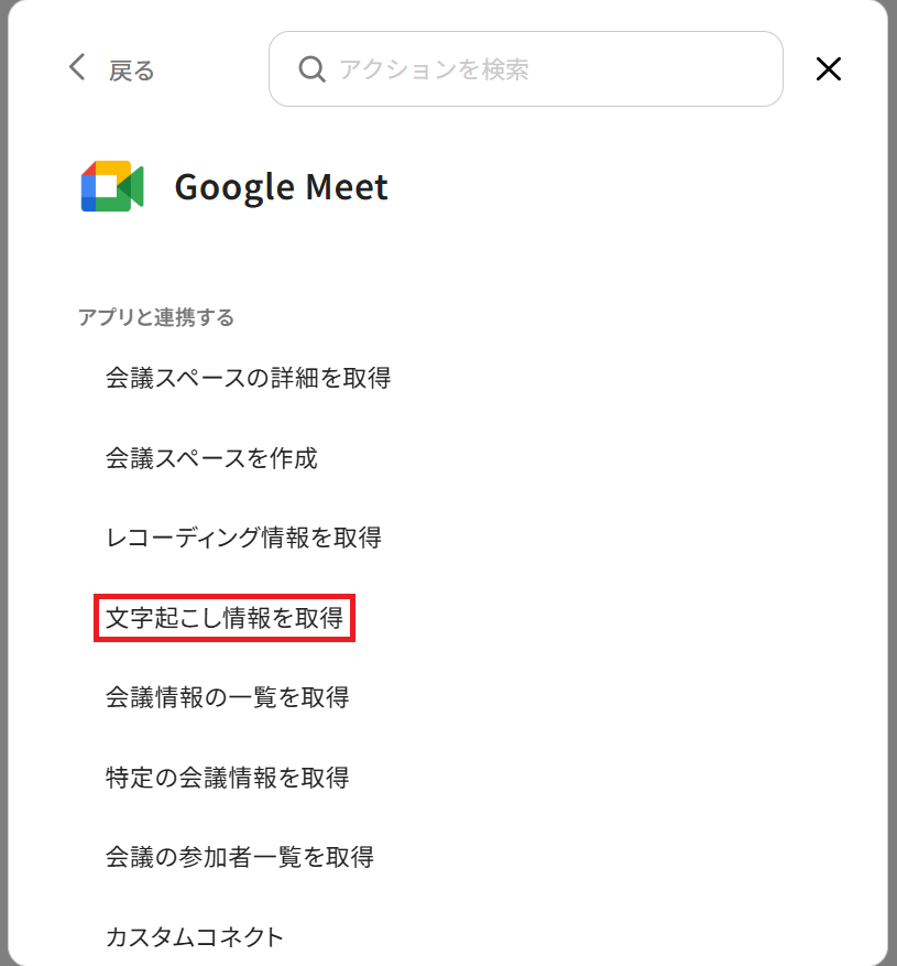 A:可能です。 Google Meetのアクション設定の下にもう一つ、Google Meetの「文字起こし情報を取得」アクションを追加し、設定してください。 更に、ここで取得したGoogleドキュメントのファイルIDを使用して、Googleドキュメントの「ドキュメントのコンテンツを取得」アクションを実行することで文字起こしデータを取得できます。