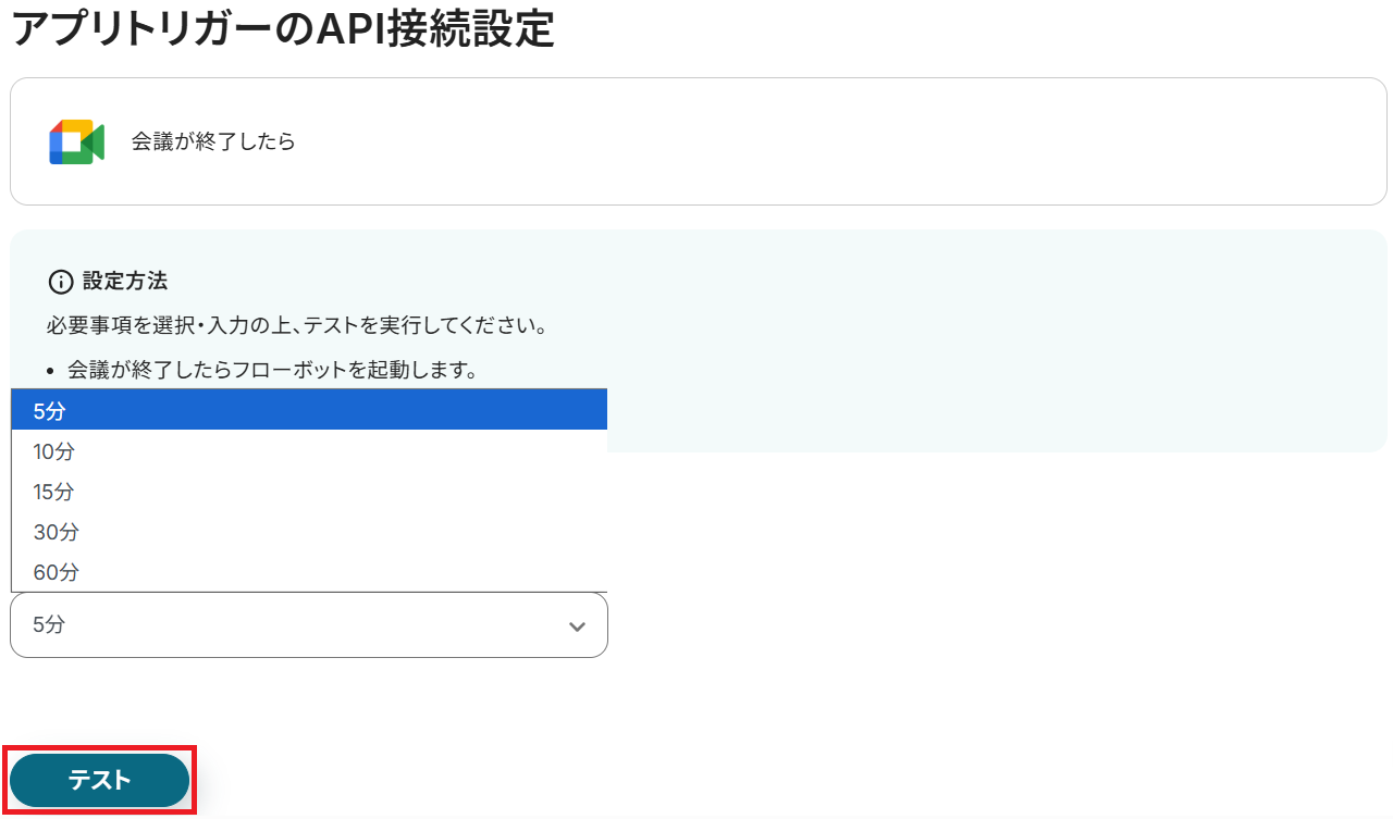 アプリトリガーのAPI接続設定という画面が表示されるので、トリガーの起動間隔をプルダウンから選択してテストしてください。