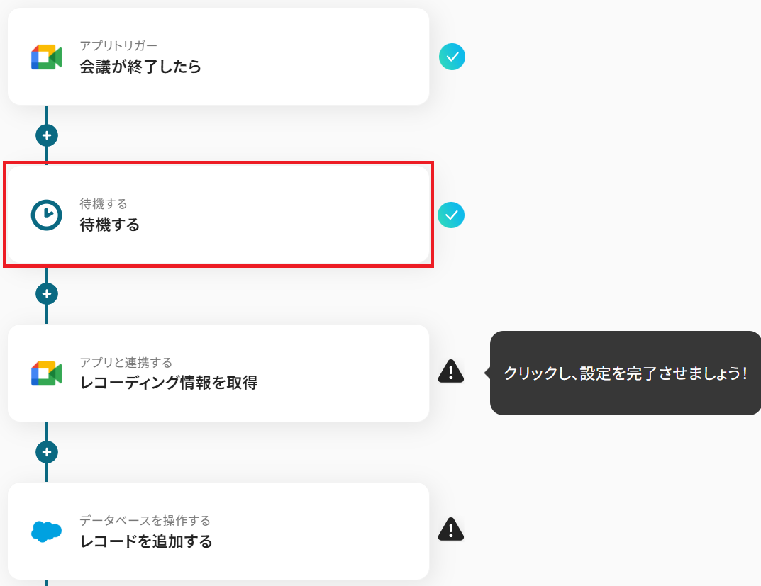 ※待機するオペレーションはチームプラン ・サクセスプラン でのみご利用いただける機能です。 フリープラン・ミニプランの場合エラーとなります。「待機する」の設定方法 も併せて確認しましょう。