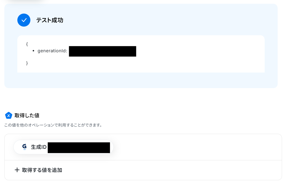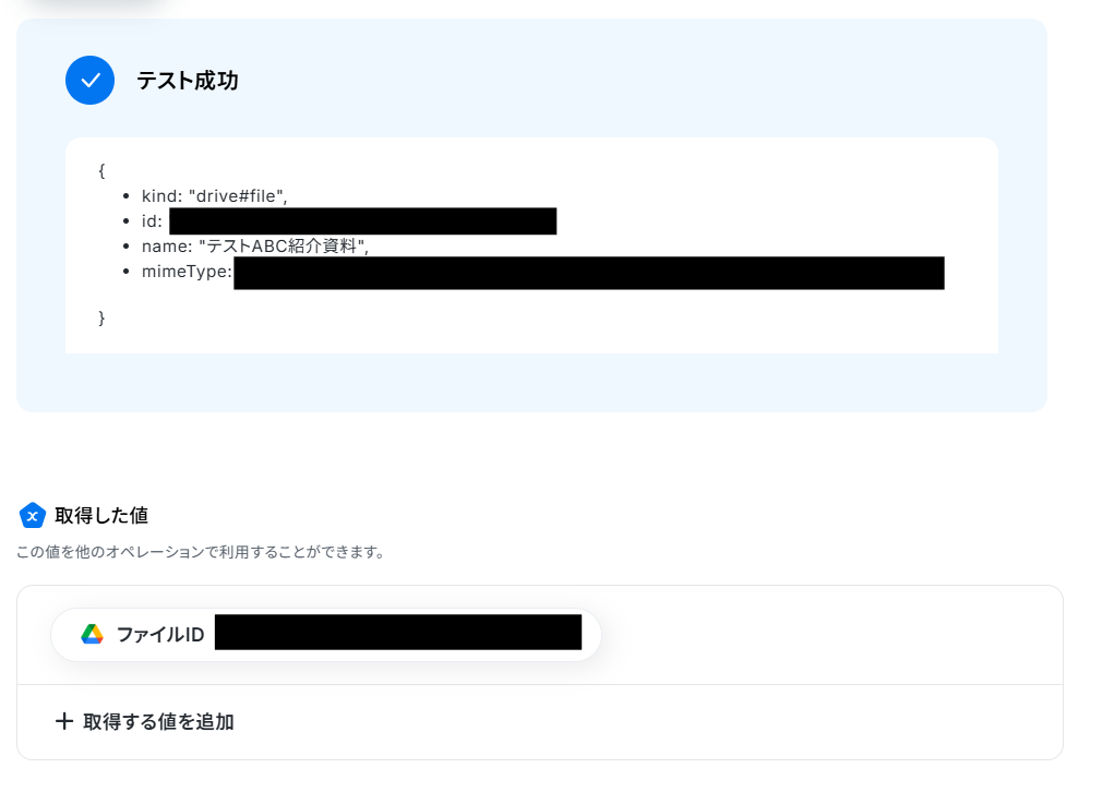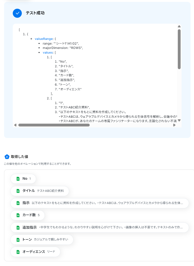 設定できたらテストを行いましょう。 テストに成功すると、取得した値にテストで取得した情報が反映されます。 完了を選択しましょう。