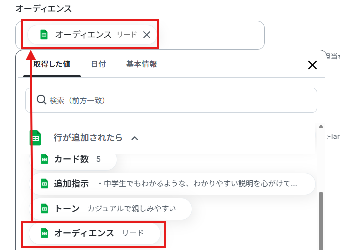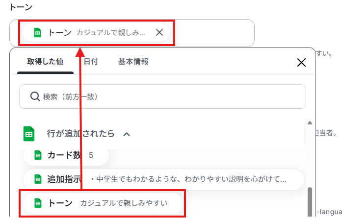 完了を選択しましょう。 ※取得した値 とは? トリガーやオペレーション設定時に、「テスト」を実行して取得した値のことを指します。 後続のオペレーション設定時の値として利用でき、フローボットを起動する度に変動した値となります。