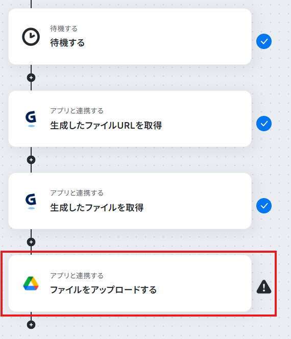 Google スプレッドシートのトリガー設定では、対象のスプレッドシートIDとタブ名を任意で設定してください。 Google Driveでファイルをアップロードするアクションでは、格納先となるフォルダのIDを任意で設定してください。 ■注意事項
