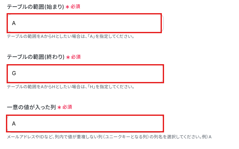 テーブルの範囲(始まり)・テーブルの範囲(終わり)・一意の値が入った列を入力しましょう。