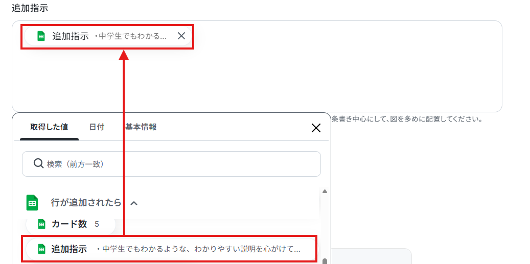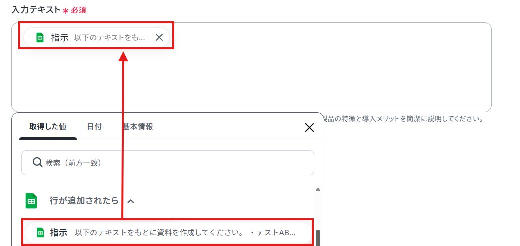 【Tips】 取得した値は、フローボットを起動する度に変動した値となります。取得した値を活用することで、フローボットが起動するたび、変動した値が入力テキストに反映されます。