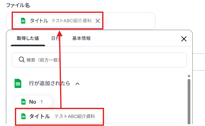 【Tips】 テキストを直接入力した部分は固定値として処理されます。 取得した値は、フローボットを起動する度に変動した値となります。取得した値を活用することで、フローボットが起動するたび、変動した値を反映したファイル名にすることが可能です。