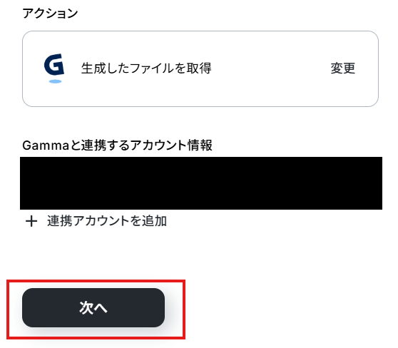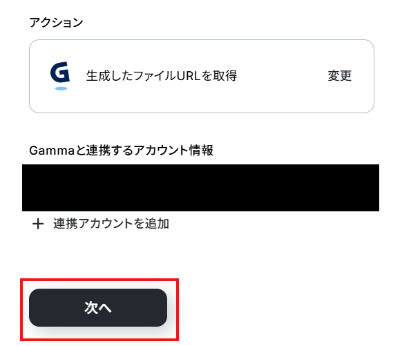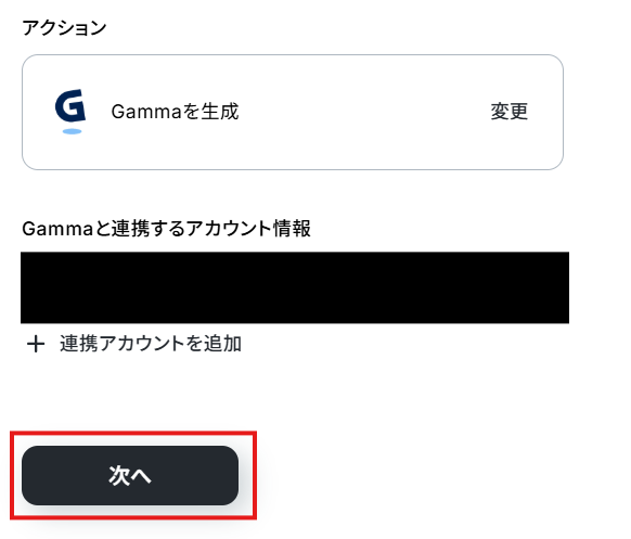 アクションはテンプレート通りのままでOKです! Gammaと連携するアカウント情報を確認し、次へをクリックして進んでください。