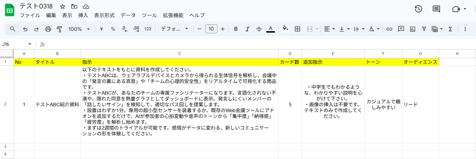 今回のフローで使用したいGoogle スプレッドシートの用意がまだの方は準備しましょう。 例として、架空の会社の商品についてリード客向けの資料を作成する想定で、以下のように作成しました!
