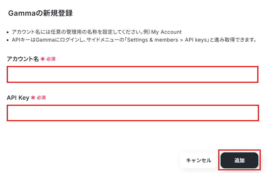 アカウント名に任意の名前を入力し、先ほど取得したAPIキーをAPI Keyに入力します。