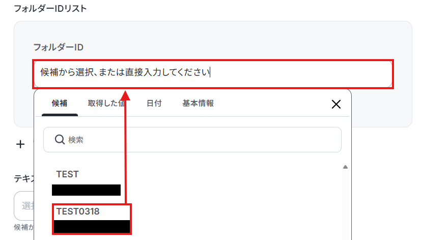 テキストモード・使用したいフォルダのフォルダーIDを候補から選択しましょう。