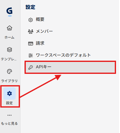 GammaとYoomのマイアプリ連携 Gammaで設定>APIキーと進み、APIキーを取得しましょう。