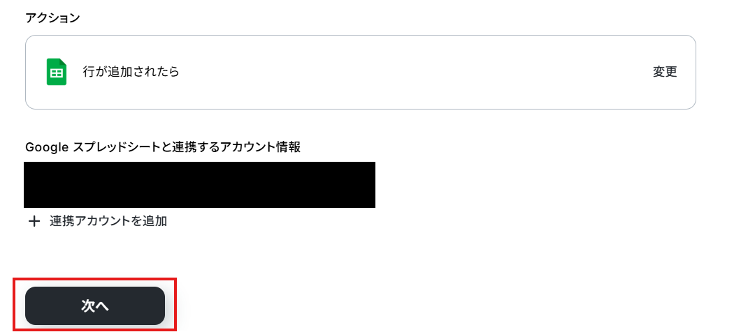 アクションはテンプレート通りのままでOKです! Google スプレッドシートと連携するアカウント情報を確認し、次へをクリックして進んでください。