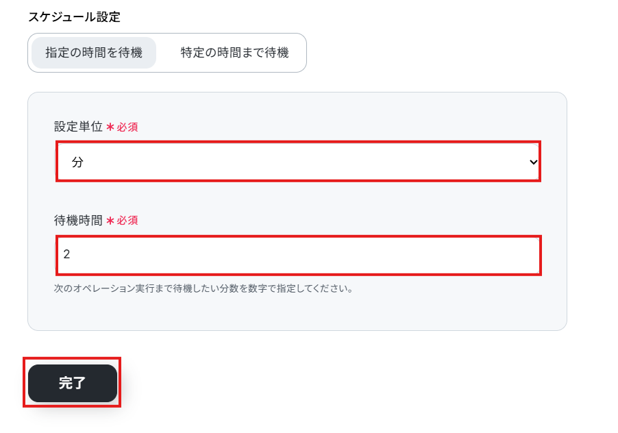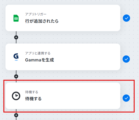 Gamma生成後、完了状態になるまで待つ必要があるため、2分待機するように設定しています。 データ量やカードの枚数などによってはさらに時間がかかる可能性がありますので、作成する資料に合わせて待機時間を設定してくださいね。 設定できたら完了を選択しましょう。