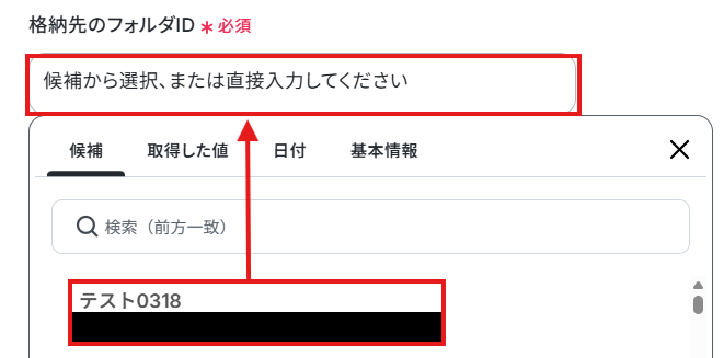 格納先のフォルダIDを候補から選択しましょう。