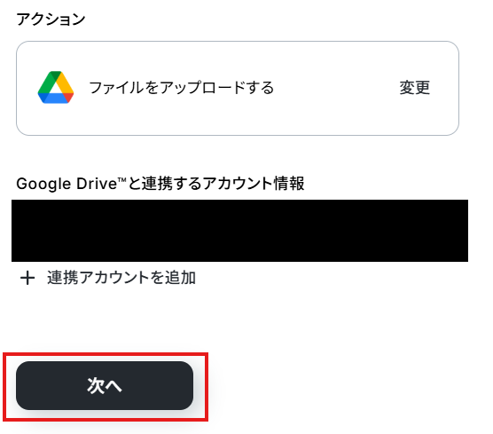 アクションはテンプレート通りのままでOKです! Google Driveと連携するアカウント情報を確認し、次へをクリックして進んでください。