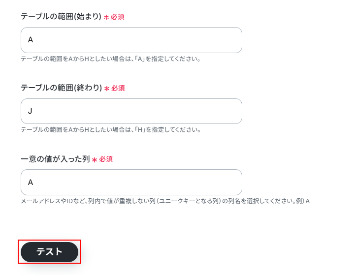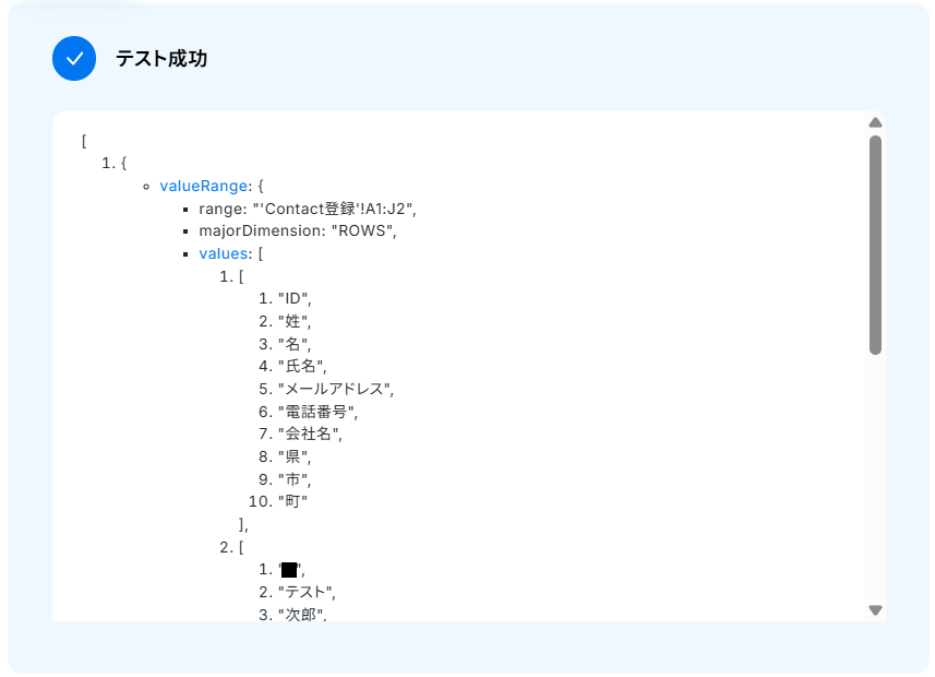 ※テスト中は行数にかかわらず、2行目のデータを取得しますのでご注意ください。 実際の稼働時は追加した行を取得します。