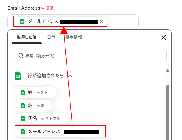 Email Address にはデフォルトで取得した値が設定されています。 項目名だけではなく、実際の値が表示されているのを確認してください。 取得した値を活用することで、固定値ではなく、トリガーが実行されるたびに最新の情報が反映できます。 また、取得した値は以下のように入力欄をクリックすることで設定できます。