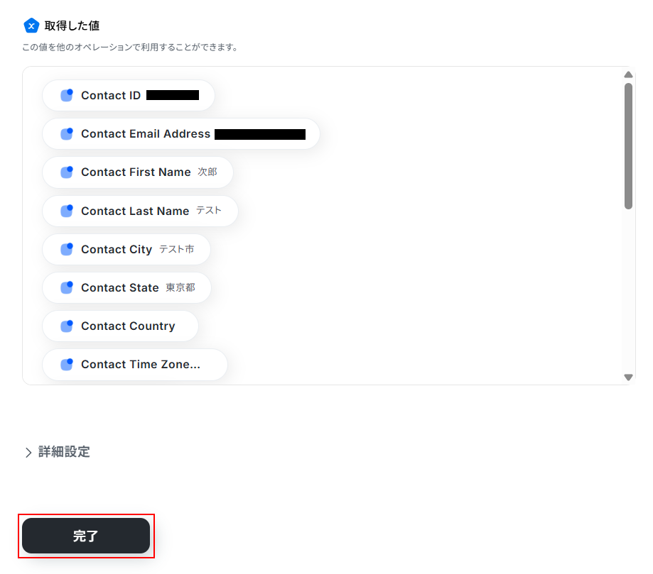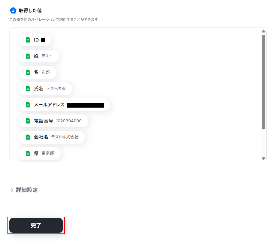 テストに成功すると、テスト成功画面と取得した値が表示されますのでご確認ください。 確認できたら完了 をクリックしましょう。