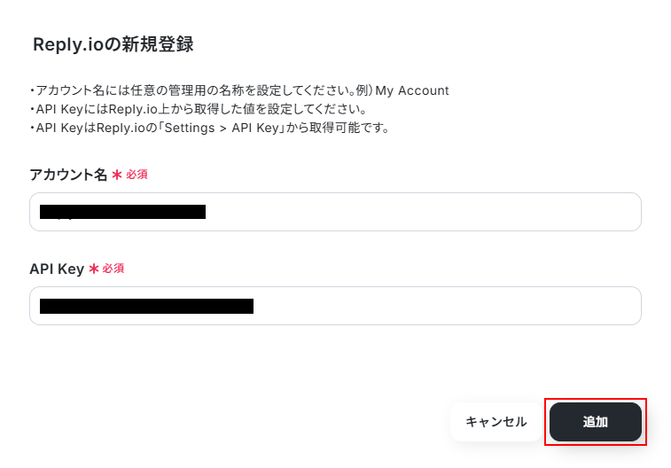 表示内容を確認し、アカウント名、API Keyを入力したら追加 をクリックします。