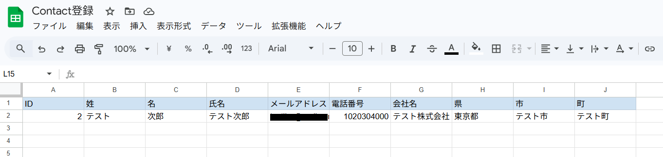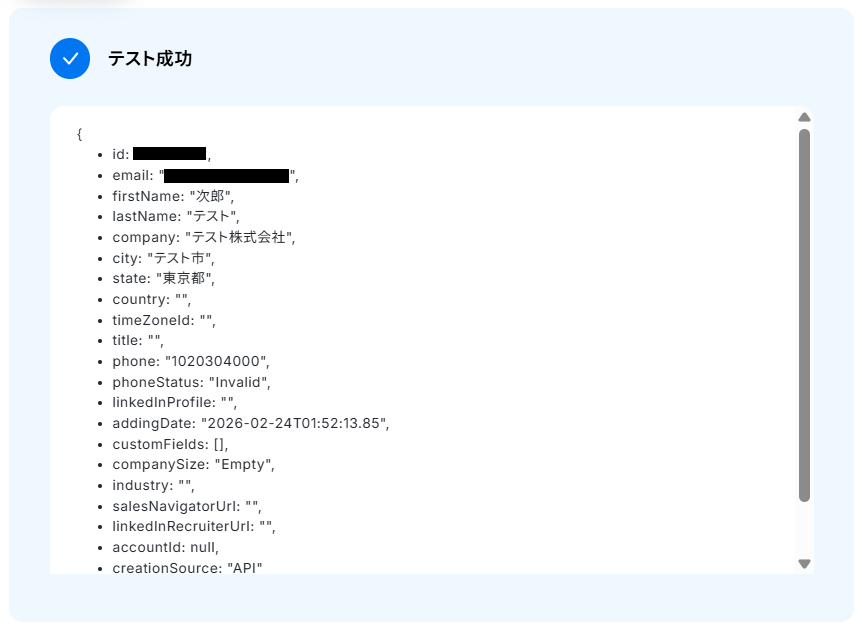 テストをクリックすると、実際にContactが作成されます。