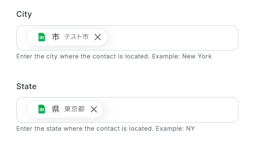 今回、City、Stateには以下のように取得した値を設定しました。 ご自身の状況に合わせて設定してください。