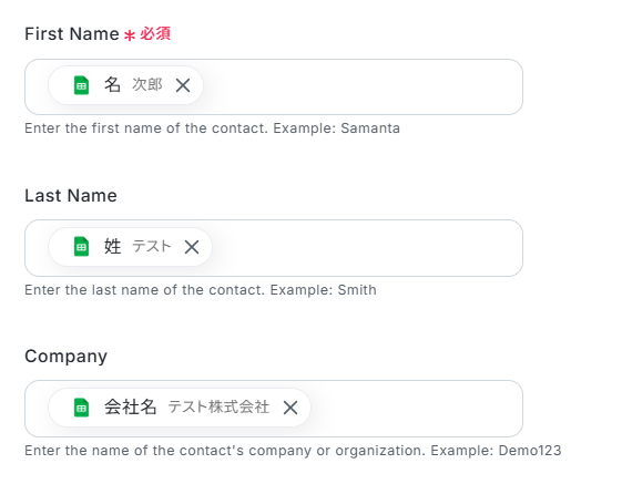 Reply.ioのオペレーションでは、Hubspotのトリガーから取得したコンタクト情報(氏名、メールアドレス、会社名など)を引用し、任意のフィールドに設定することが可能です。 ■注意事項