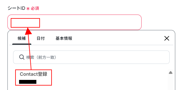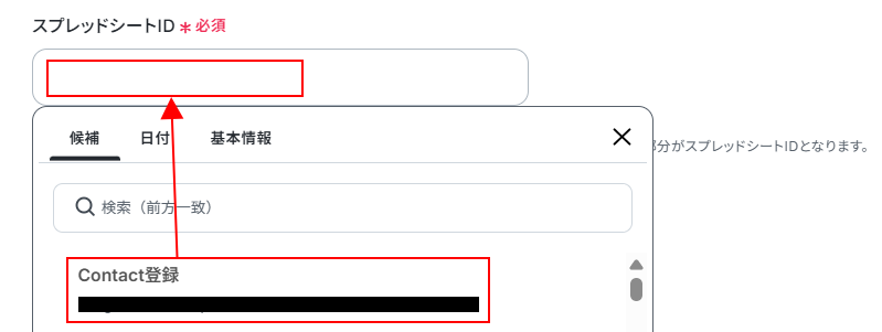Yoomの画面に戻り、スプレッドID・シートIDを設定します。 入力欄をクリックし、表示された候補の中から行を追加したGoogle スプレッドシートを選択してください。
