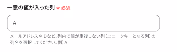 今回用意したテスト用のスプレッドシートでは、「No」が同列内で値が被ることがない列となるので、「A」と入力します。