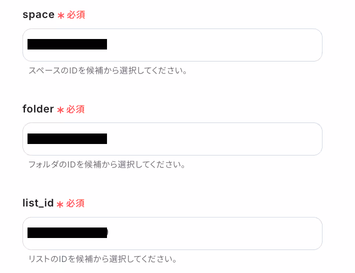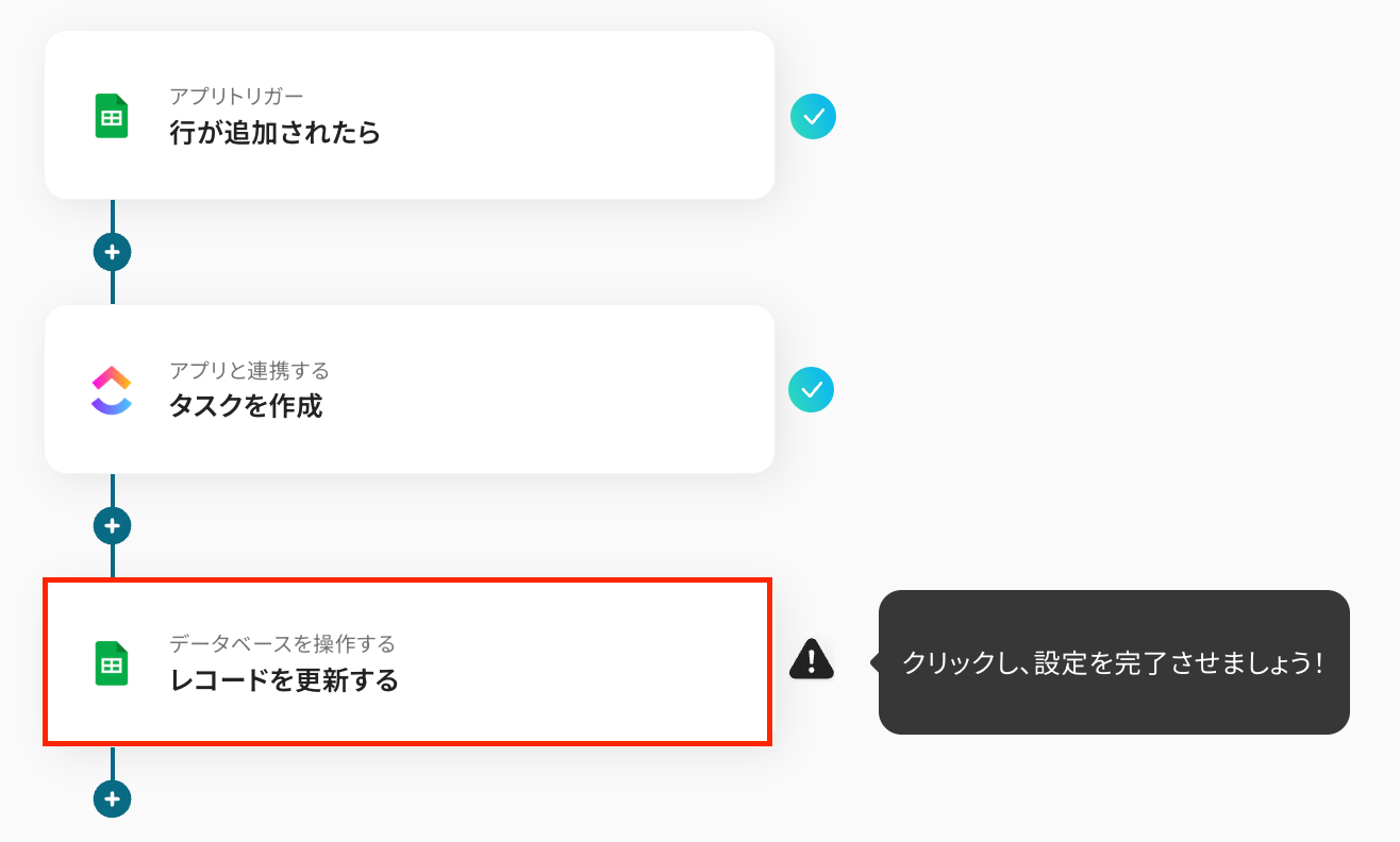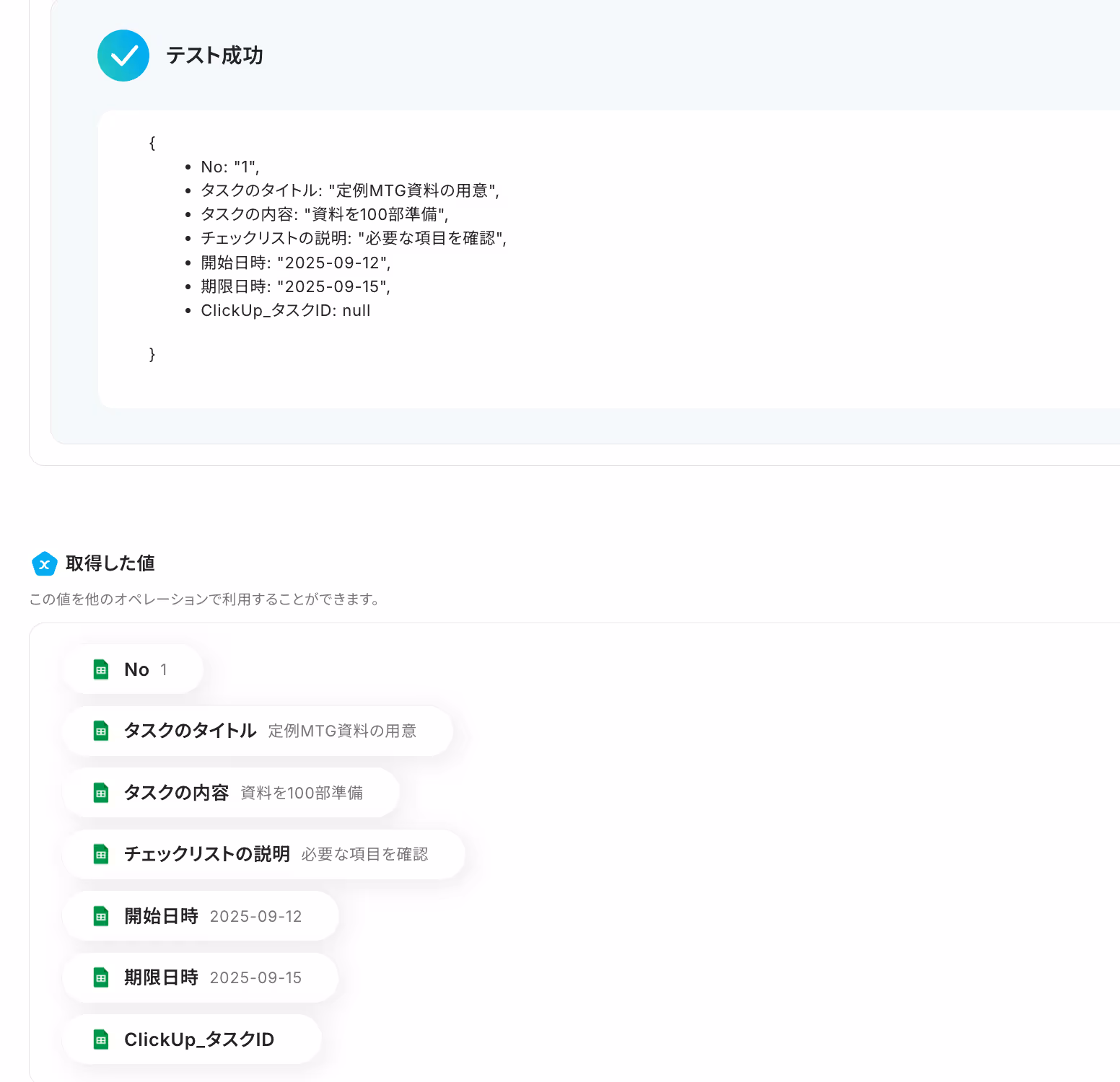 「ステップ5:Google スプレッドシートのレコード更新設定」の解説時に触れたように、ClickUpのタスクIDをGoogle スプレッドシートに保持しておくことが必要となりますので、その点だけご注意ください。