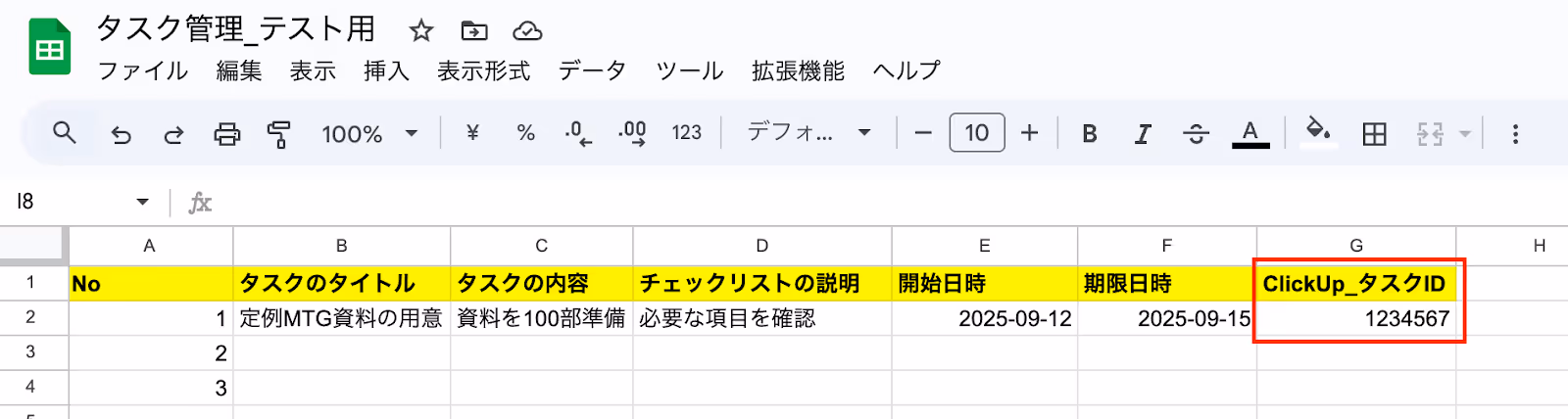 設定が完了したら「テスト」をクリックし、Google スプレッドシートにタスクIDが反映されていることを確認しましょう。