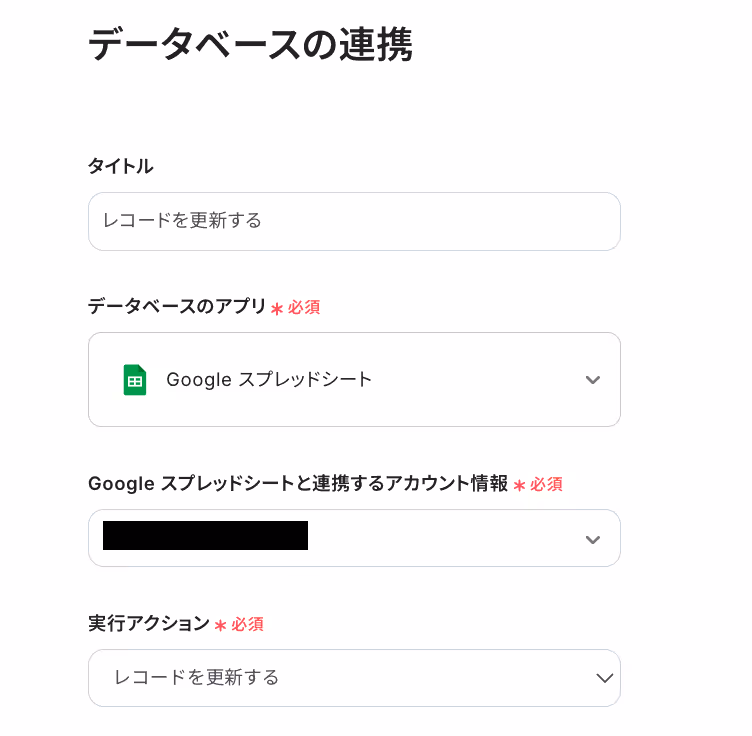 「スプレッドシートID」・「スプレッドシートのタブ名」を、入力欄をクリックして表示される候補から、ステップ3で連携した「スプレッドシート」と「タブ」を選択してください。