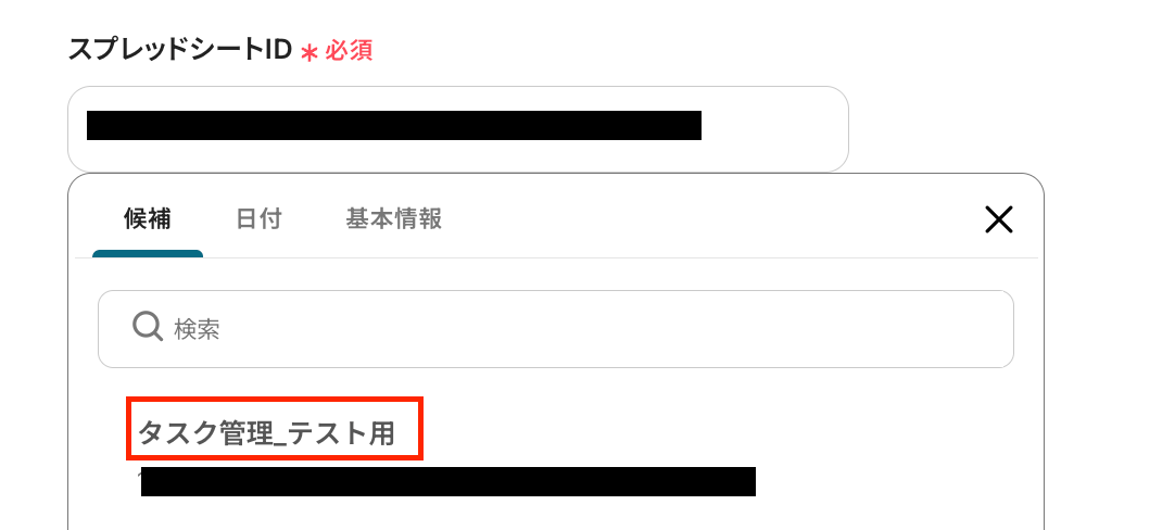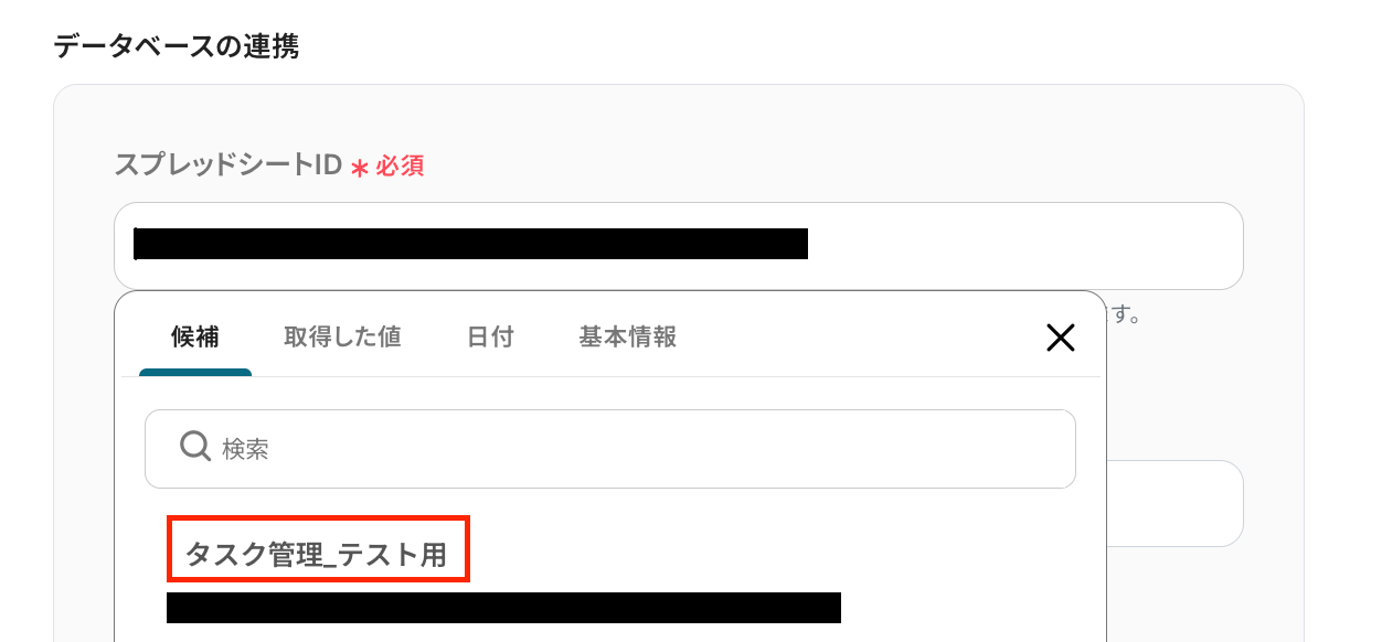 「スプレッドシートID」と「シートID」は、入力欄をクリックして表示される候補からフローで使用するものを選択しましょう。